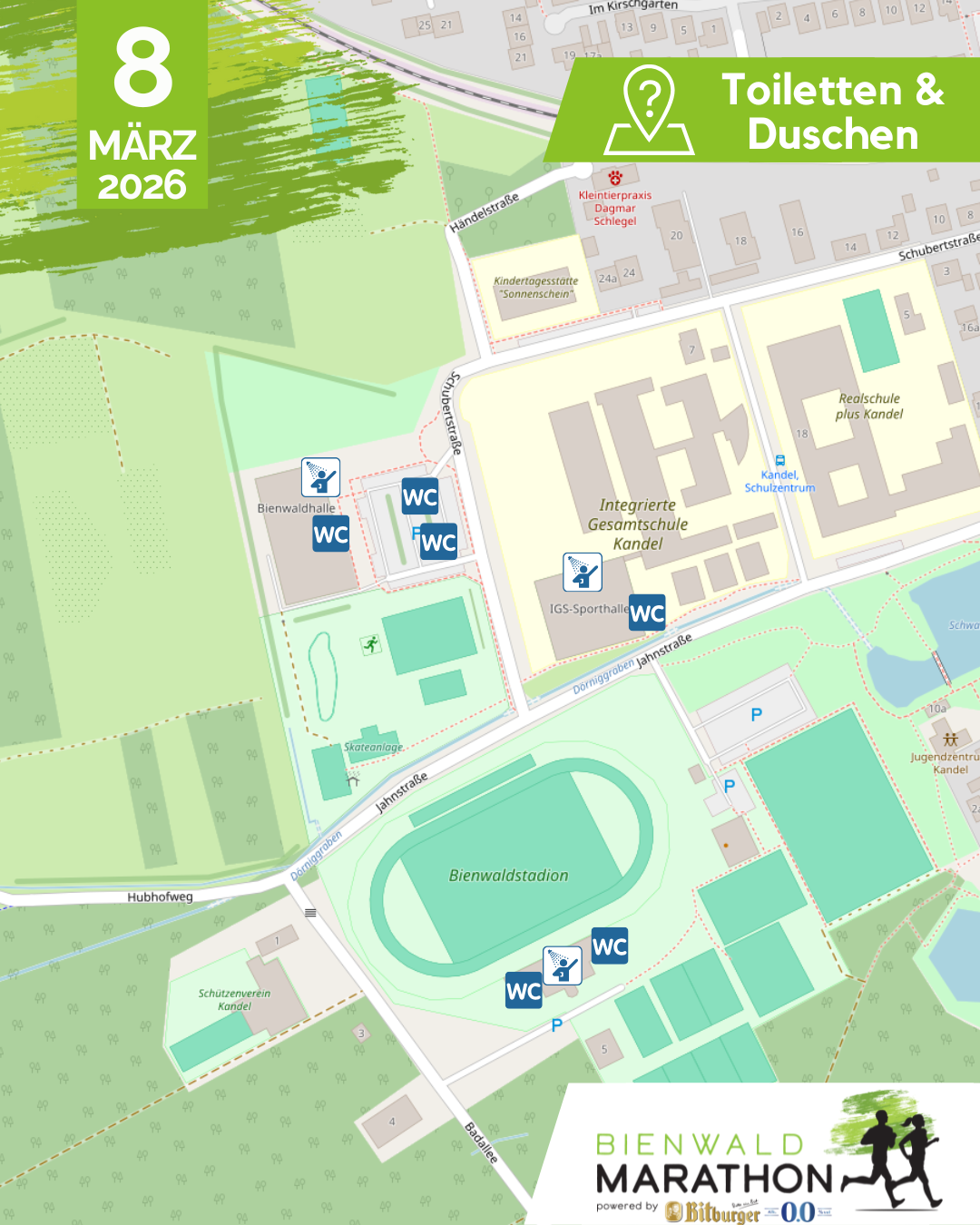Toiletten sind ebenfalls zahlreich vorhanden. Es kann jedoch natürlich bei Stoßzeiten zu Wartezeiten kommen (vor allem vor dem Start) bitte weicht da vor allem auch auf unsere mobilen Toiletten direkt an der Startlinie aus.
