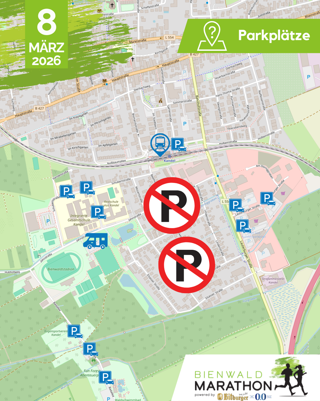 Unser kostenloser Bienwald Express bringt deine Liebsten an die Strecke, dass Sie dich dort direkt anfeuern können. Die Fahrzeiten findet Ihr in dem PDF anbei.